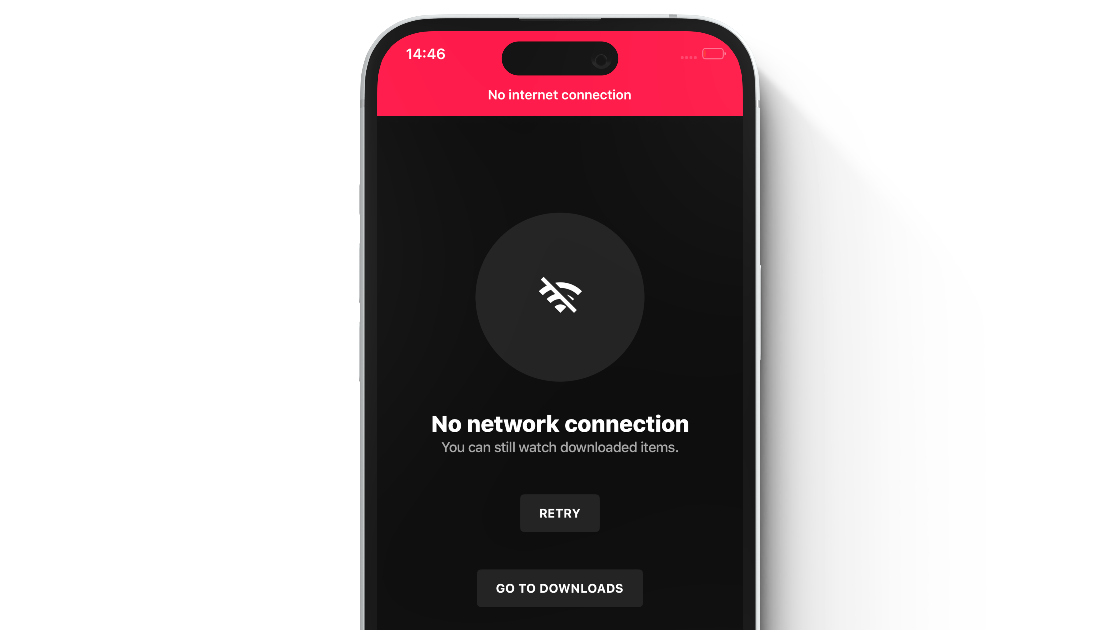 Offline Mode is triggered if the user has a limited/no internet connectivity. This feature provides a customizable explanatory header, a retry button, and may pair with the downloads feature.